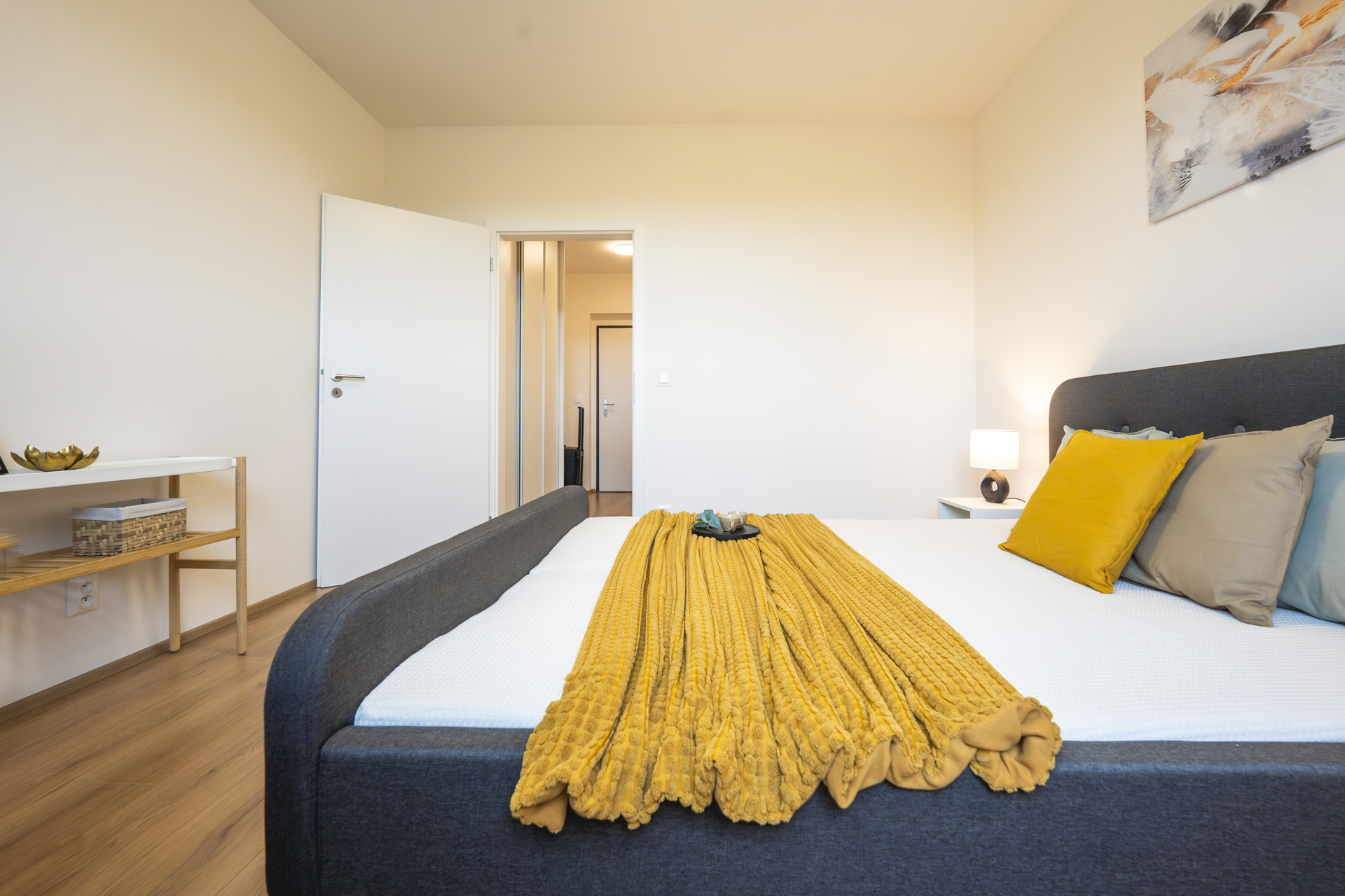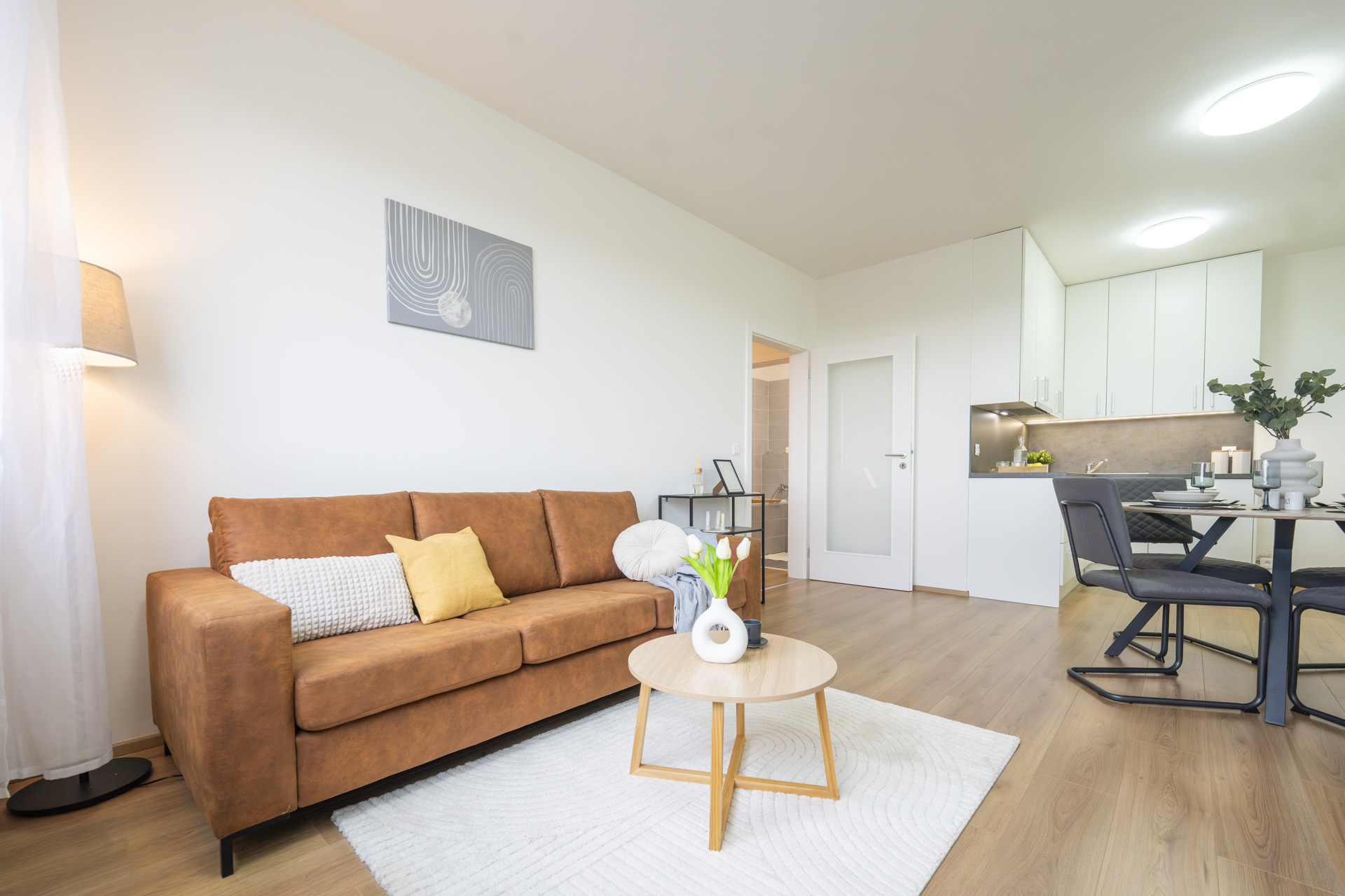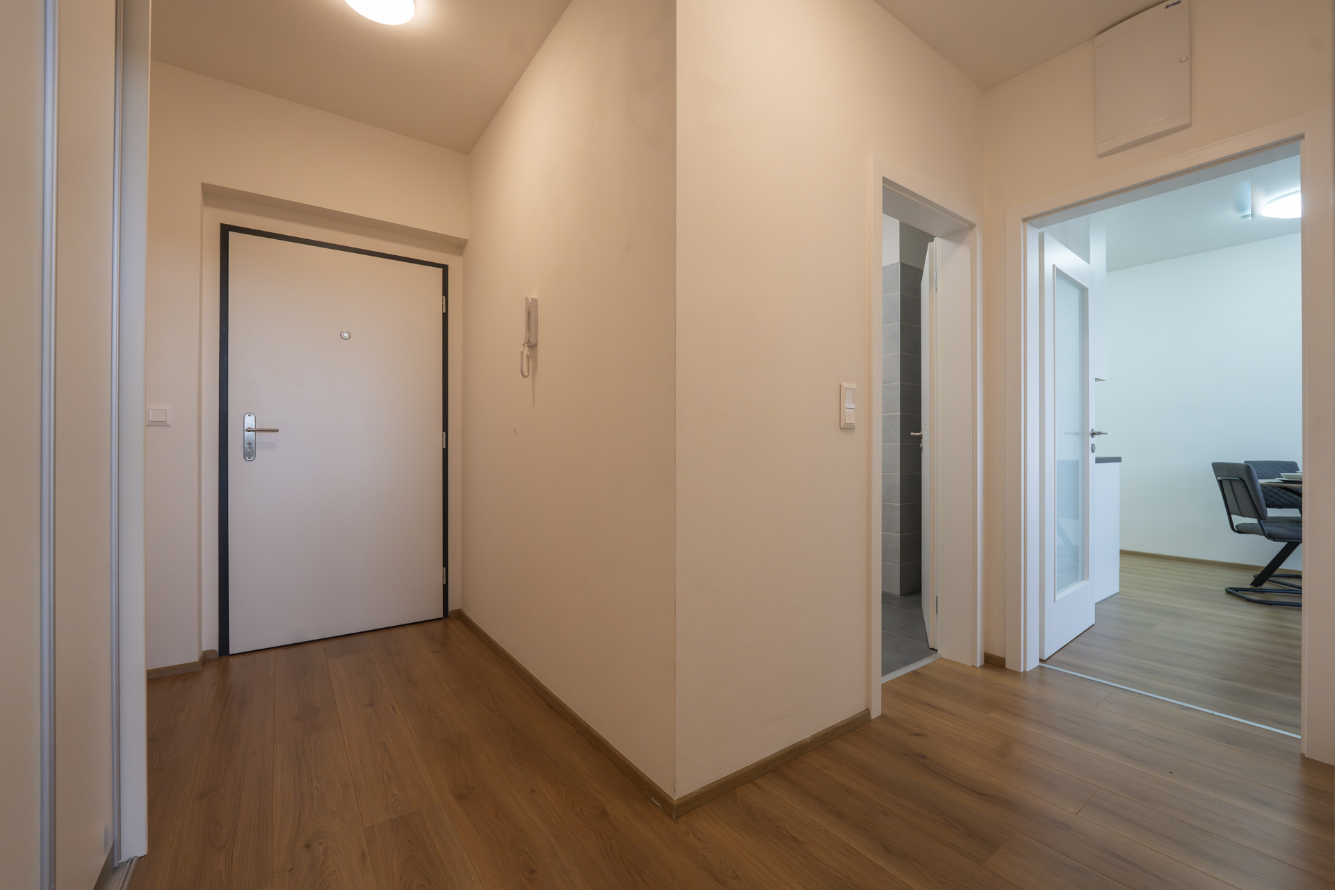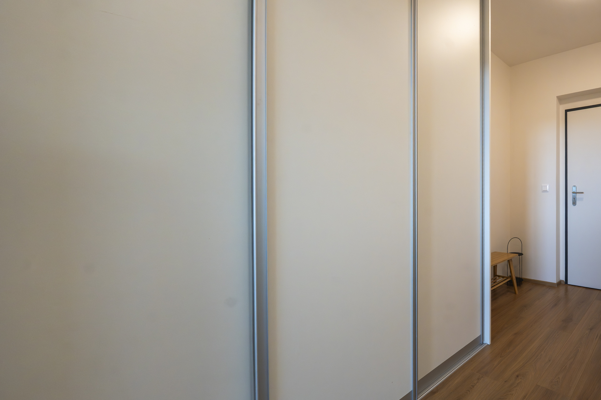 Dispozice bytu je prakticky řešena. Při vstupu do bytu vás přivítá předsíň s prostornou vestavnou šatní skříní, která poskytuje dostatek úložného prostoru. Dále byt nabízí neprůchozí ložnici, koupelnu s vanou, toaletou a prostorem pro pračku. Dominantou celého bytu je prostorný a světlý obývací pokoj s moderním kuchyňským koutem. Pro lepší představu o rozložení místností a celkové atmosféře bytu si můžete ještě před osobní prohlídkou spustit virtuální 3D prohlídku, která vás bytem provede a umožní vám přesně si ho přeměřit.