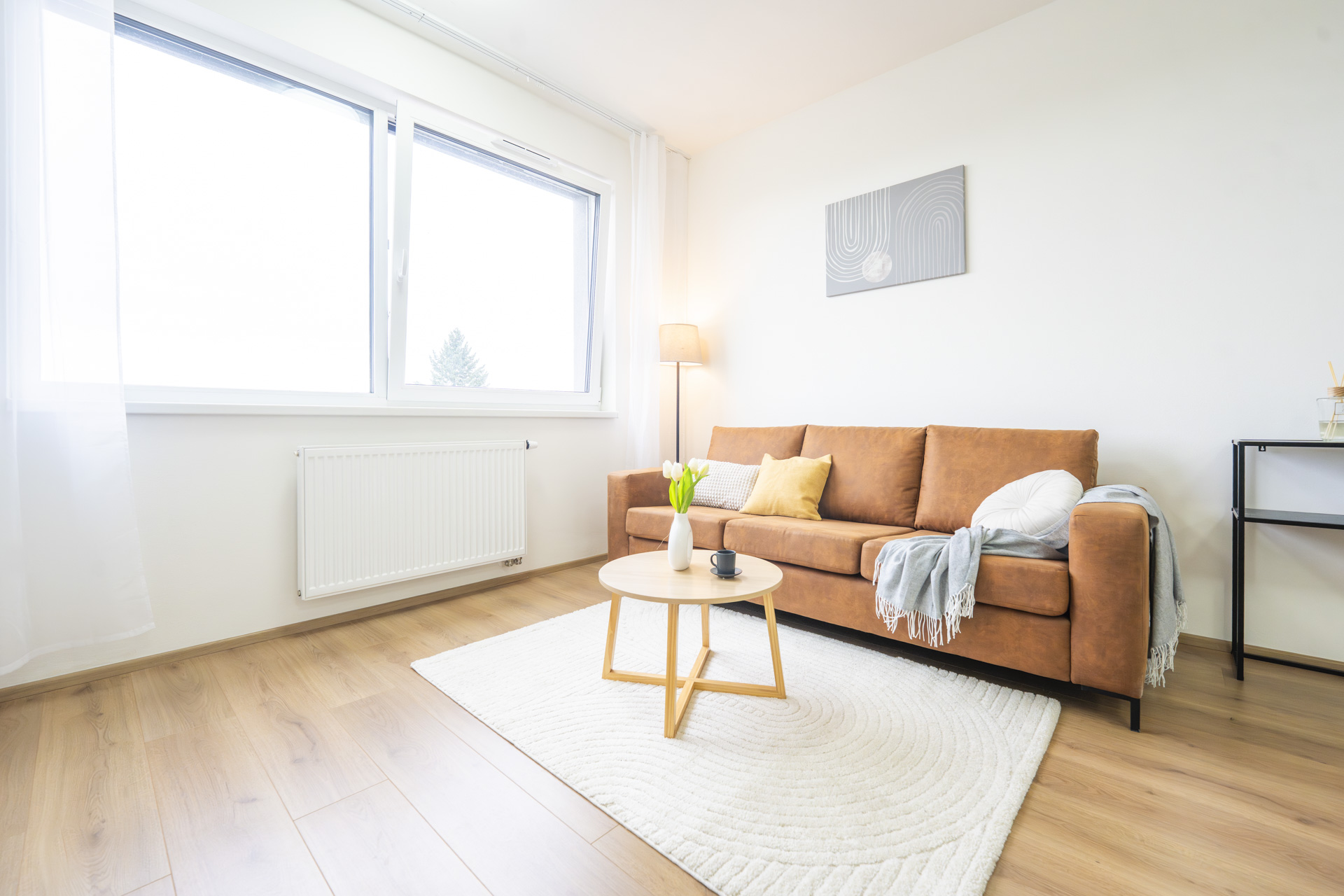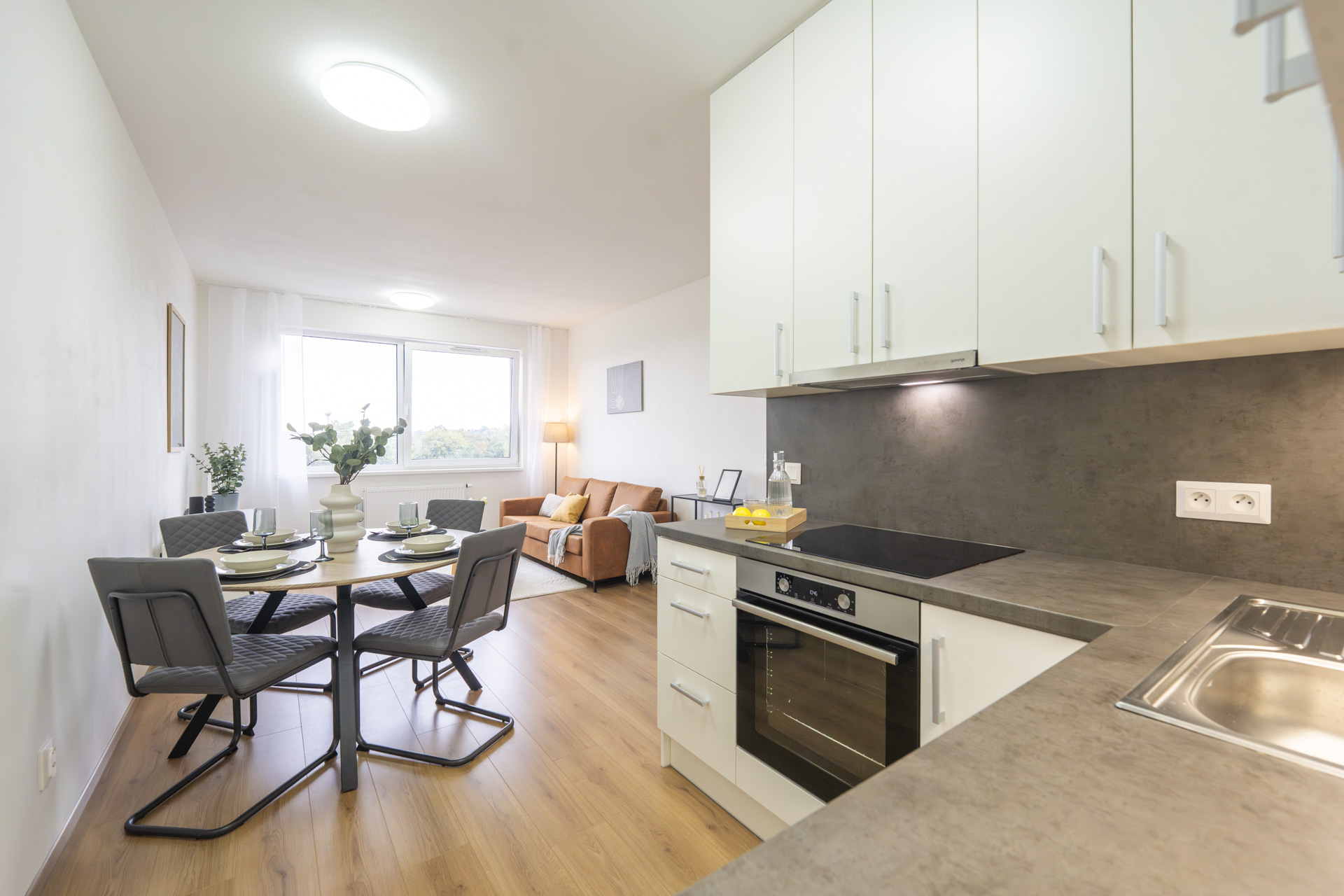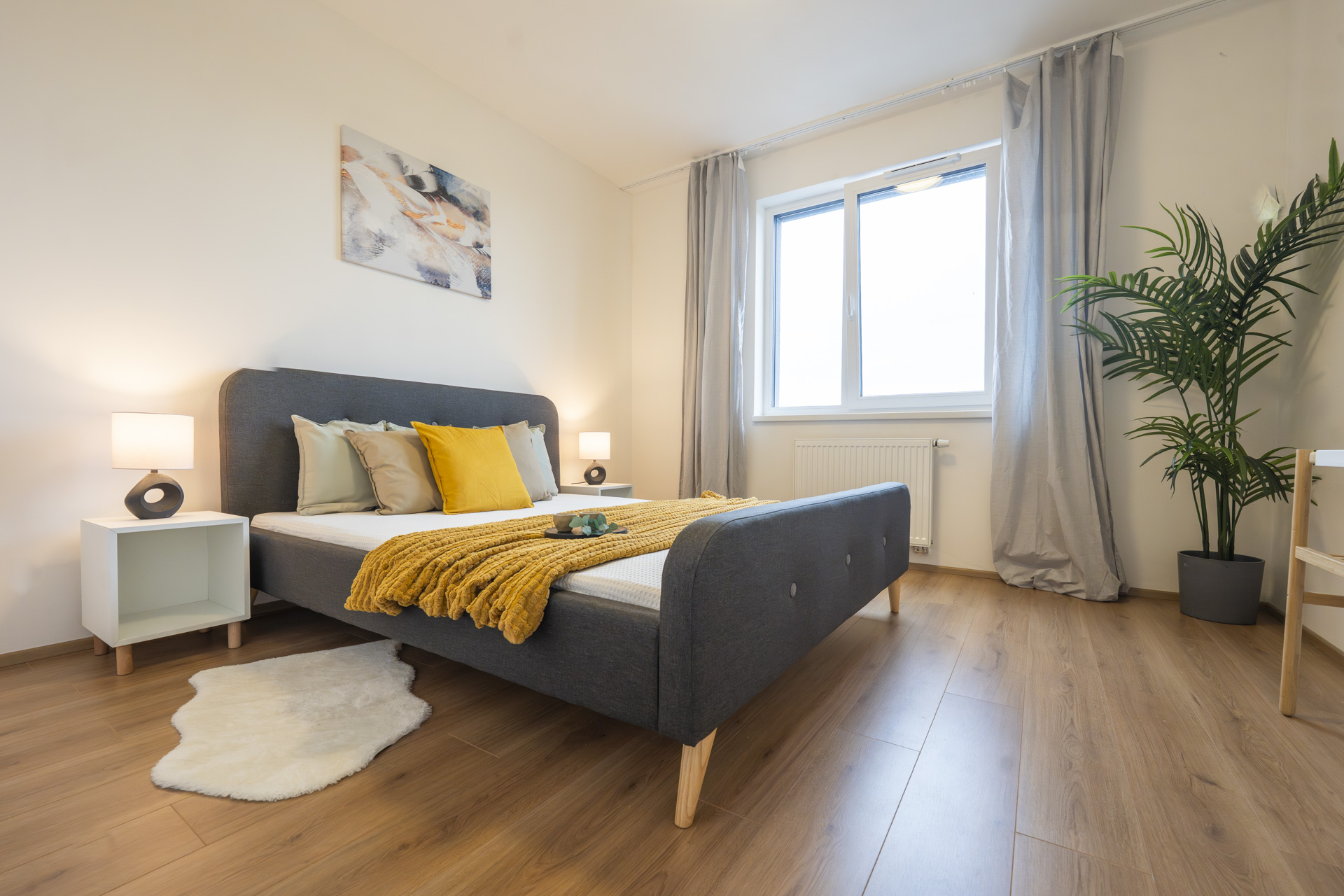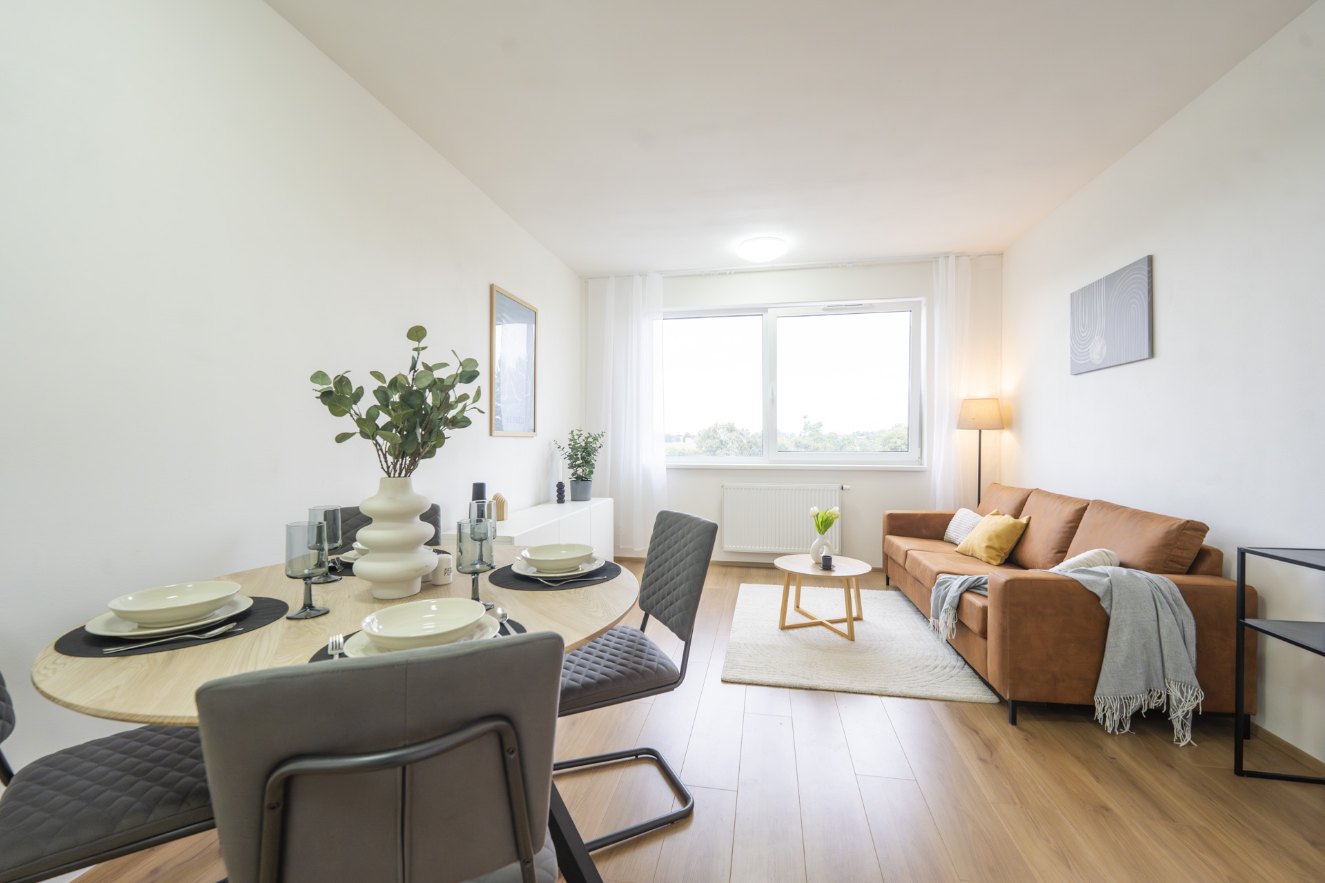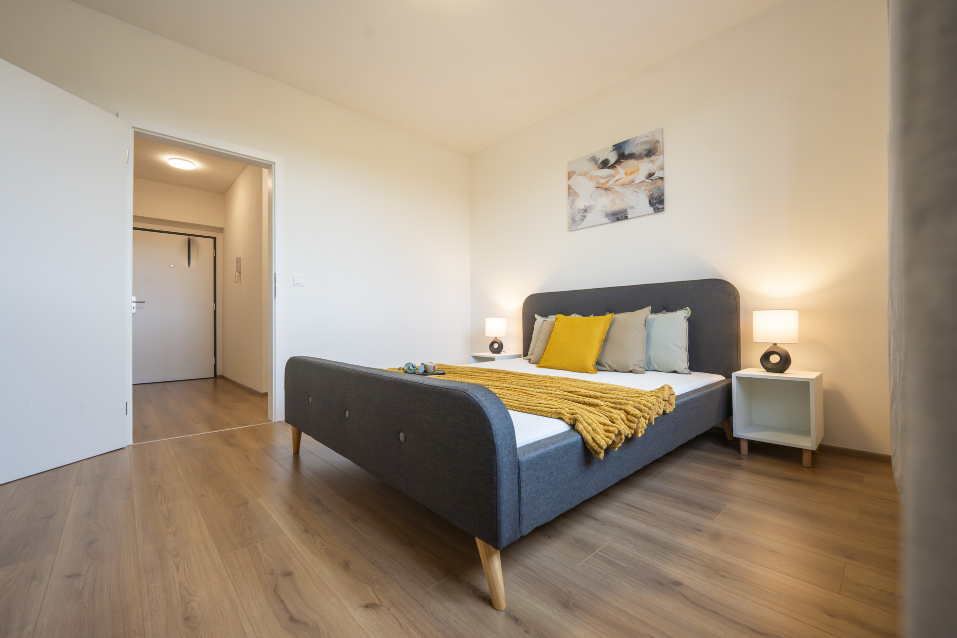 Dispozice bytu je prakticky řešena. Při vstupu do bytu vás přivítá předsíň s prostornou vestavnou šatní skříní, která poskytuje dostatek úložného prostoru. Dále byt nabízí neprůchozí ložnici, koupelnu s vanou, toaletou a prostorem pro pračku. Dominantou celého bytu je prostorný a světlý obývací pokoj s moderním kuchyňským koutem. Pro lepší představu o rozložení místností a celkové atmosféře bytu si můžete ještě před osobní prohlídkou spustit virtuální 3D prohlídku, která vás bytem provede a umožní vám přesně si ho přeměřit.