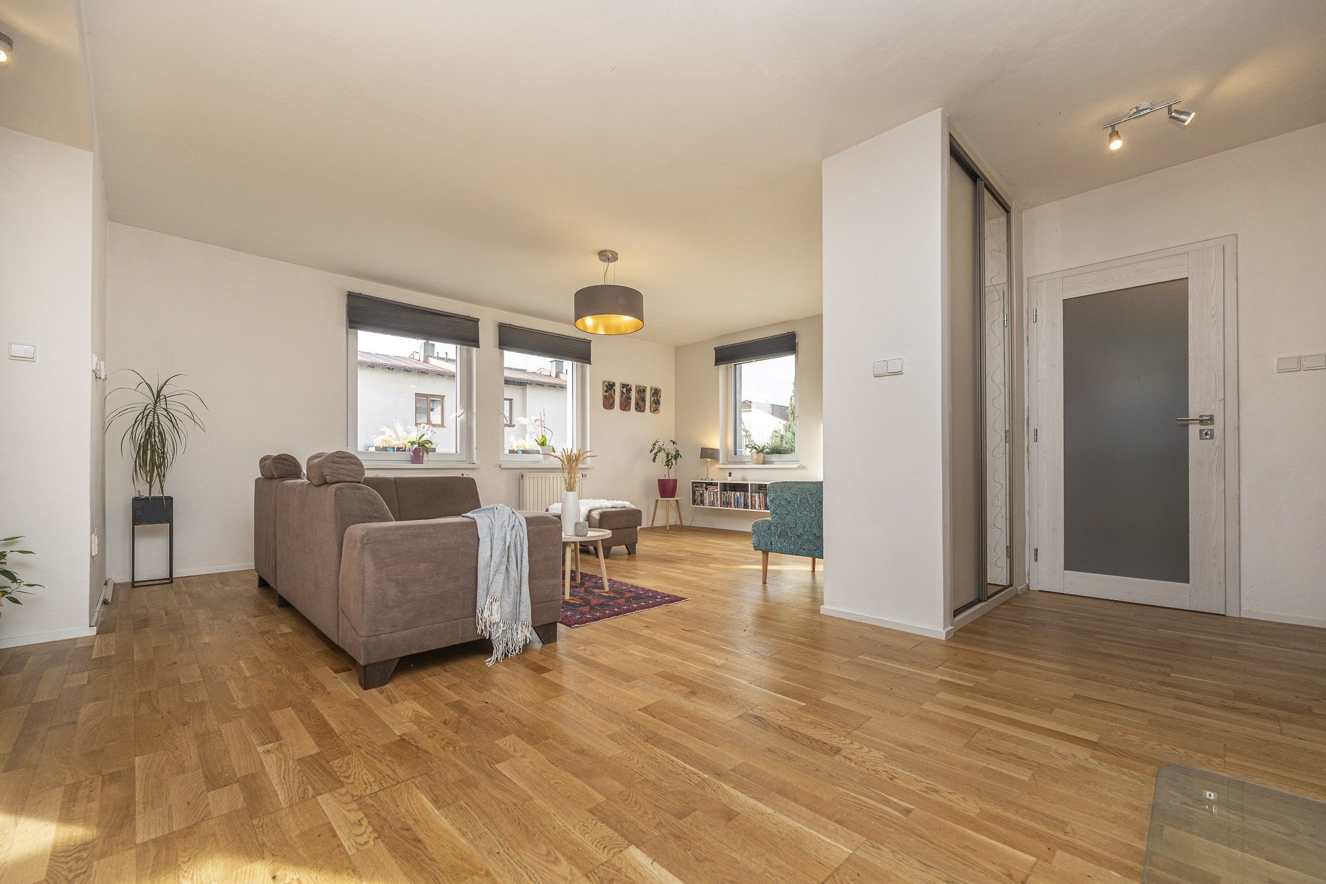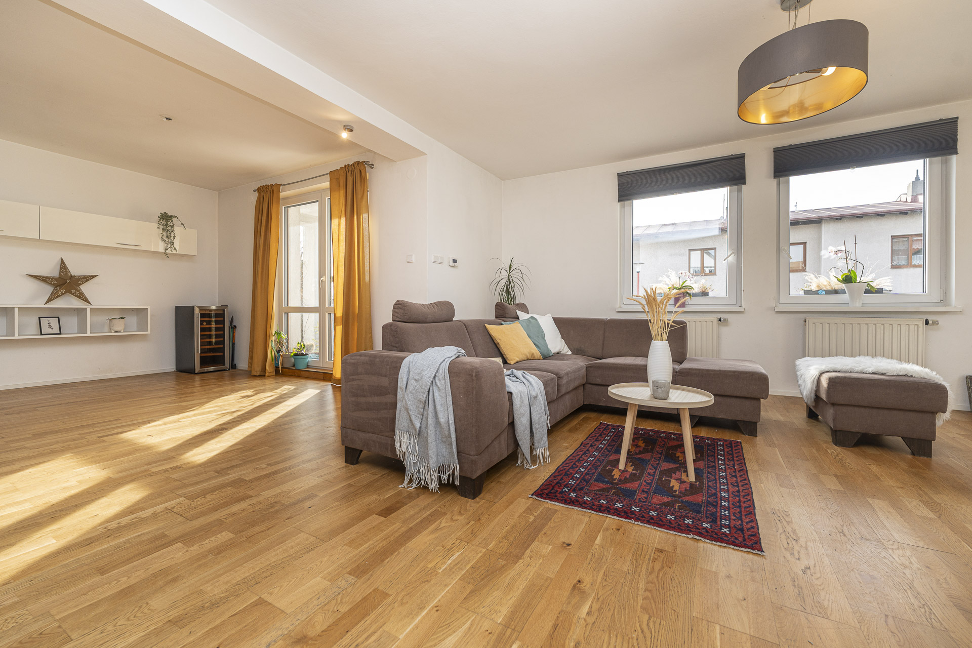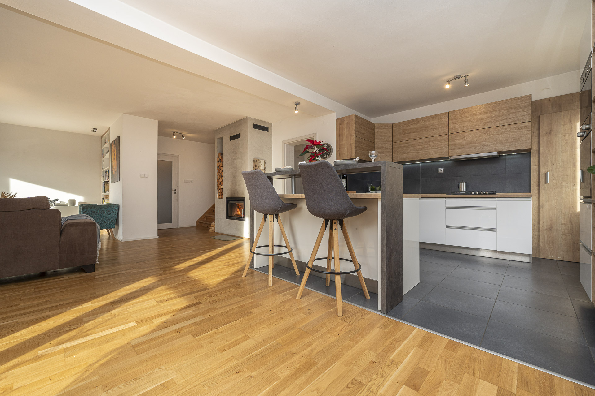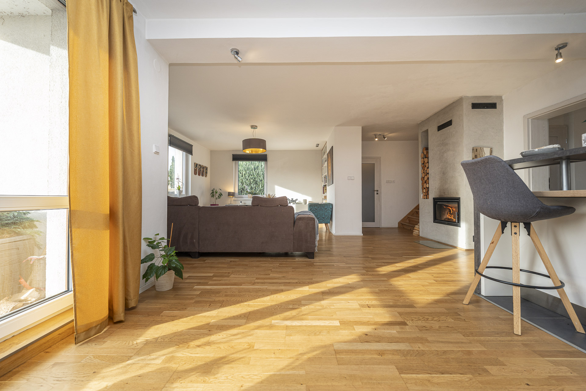 – prostorný obývací pokoj s krbovými kamny propojený s kuchyní a jídelnou: 53 m²